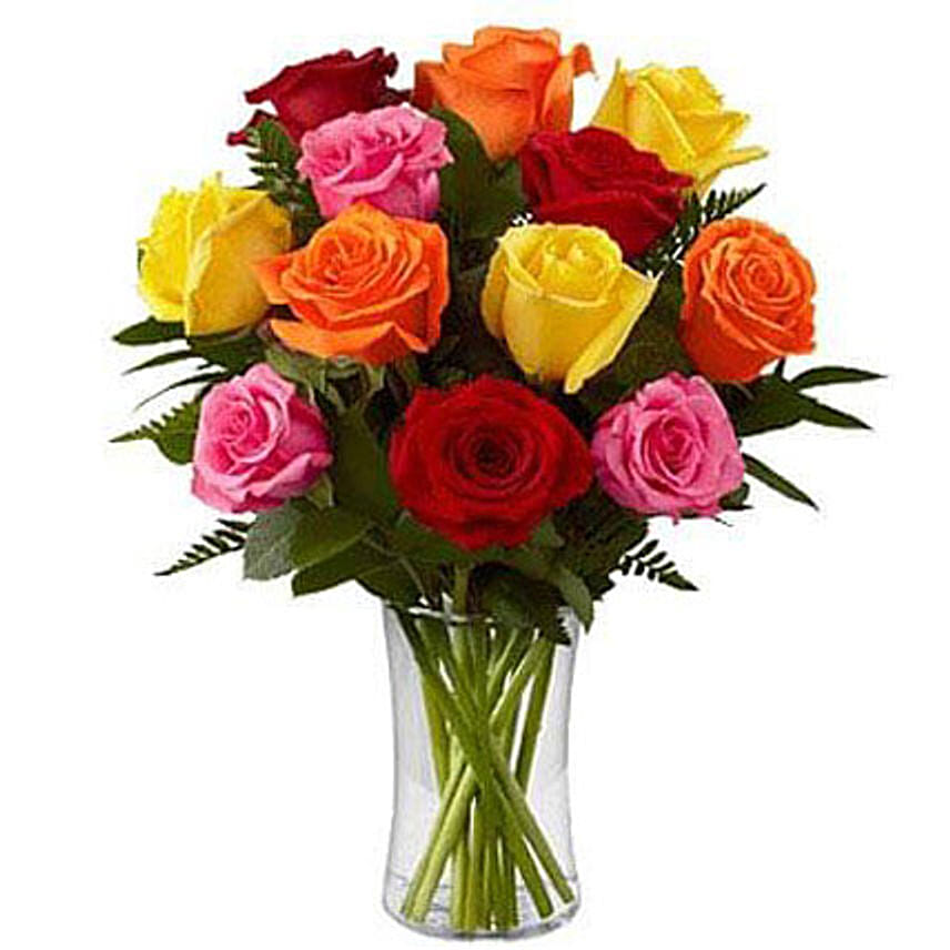 Simple and elegant red, pink, orange, and yellow roses are brought together in a glass vase to make an impeccable gift for your special day of love. Birthday, anniversary, Valentine’s Day, or any other special day can be greeted with this gift of flowers. This is an energetic bouquet of love as it has many colors in it.