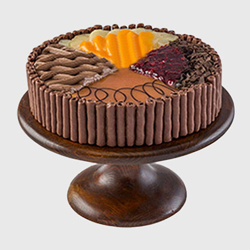 • Chocolate sponge cake covered with chocolate mousse, crushed almond and a layer of raspberry decorated with the delicious chocolate glace