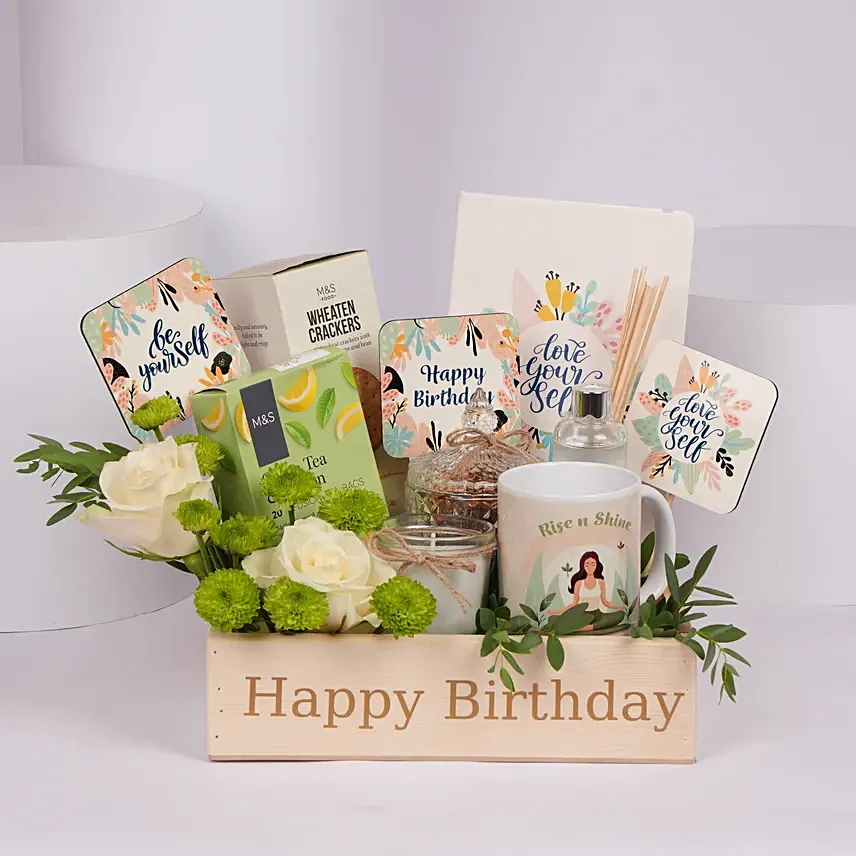 This graceful and serene gift arrangement brings together natural beauty and thoughtful elements, perfect for relaxing moments and elegant gifting. Delicate florals, wellness picks, and elegant accessories are all curated in a refined setup to uplift any occasion.