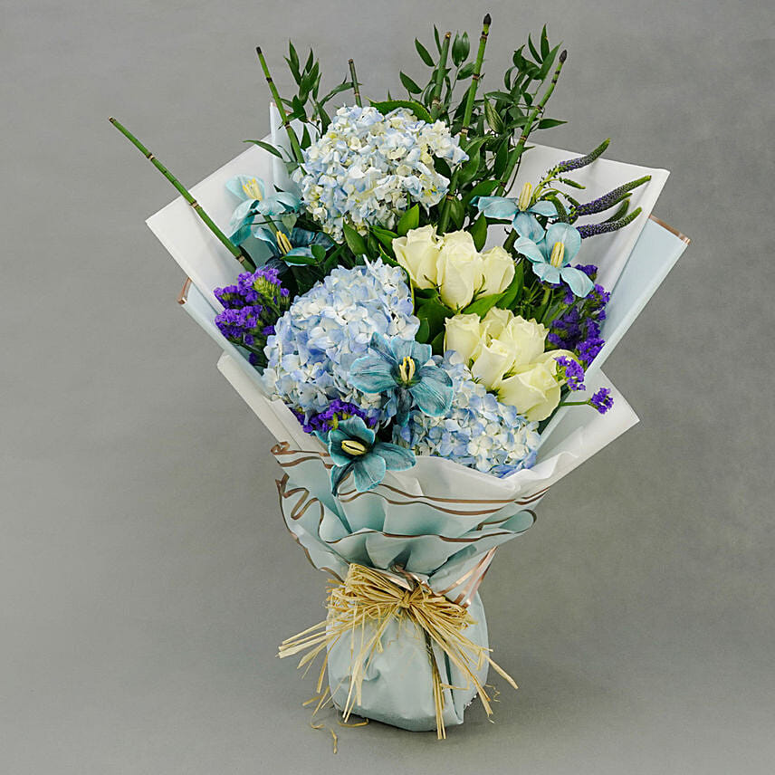 Overflowing at the seams with beauty and charm, the bouquet of exquisite flowers will deliver peace and joy at your loved one’s door. The combination of blue and white blooms with a touch of green snake grass is the ultimate wow gift beautifully wrapped and tied.