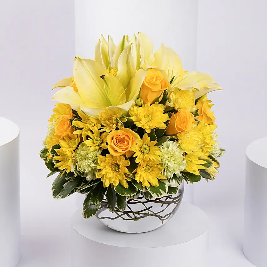 Filled with magical fresh mixed flowers, this fish bowl floral arrangement exudes a burst of extravaganza.