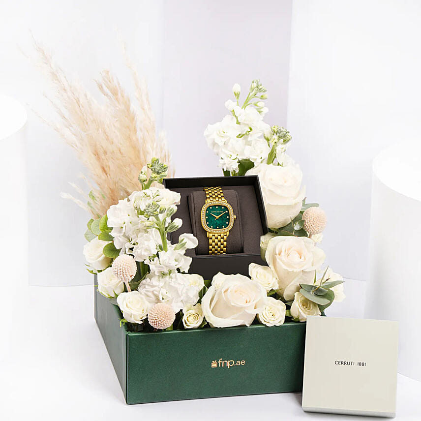 ""This exquisite Cerruti 1881 women’s watch is a statement of sophistication, designed for the modern woman who appreciates both fashion and functionality. Paired with a stunning arrangement of fresh white flowers, this luxurious gift set is a beautiful expression of love, appreciation, and celebration perfect for any ocassion.""
