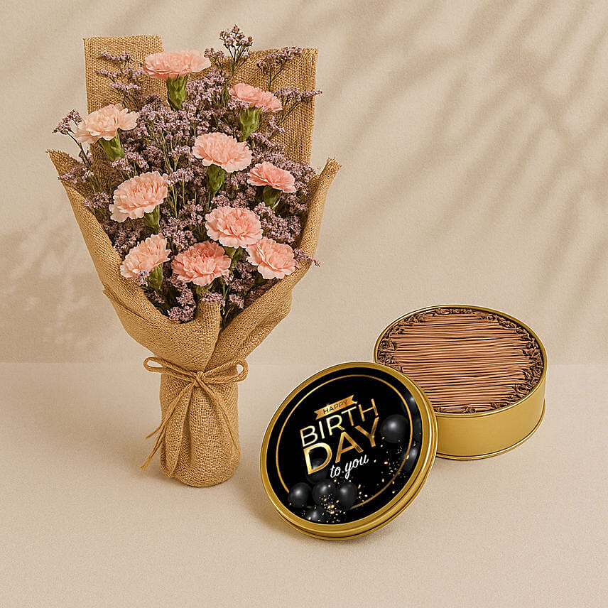 Charming Pink Carnations With Happy Birthday Cake In Tin Box