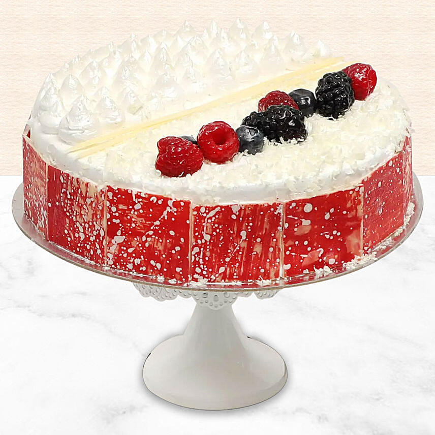 The awesome combination of vanilla sponge, vanilla cream, and sugar syrup, this creamy vanilla cake is best to take your sweet buds on a tour to heaven and make them delve in divine flavor. The cake is garnished with fresh strawberry, red currant, raspberry, and chocolate icing to make it taste more scrumptious.