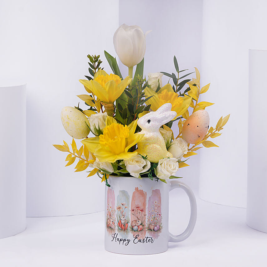 Bring home the charm of Easter mornings with this delightful floral arrangement,thoughtfully curated in a festive ceramic mug. Featuring cheerful yellow daffodils, elegant white tulips, and delicate spray roses,this arrangement captures the essence of spring’s freshness and renewal.Accented with Easter eggs and a cute bunny detail,it creates a heartwarming gift that blends beauty, joy, and seasonal celebration perfect for brightening any space or surprising loved ones