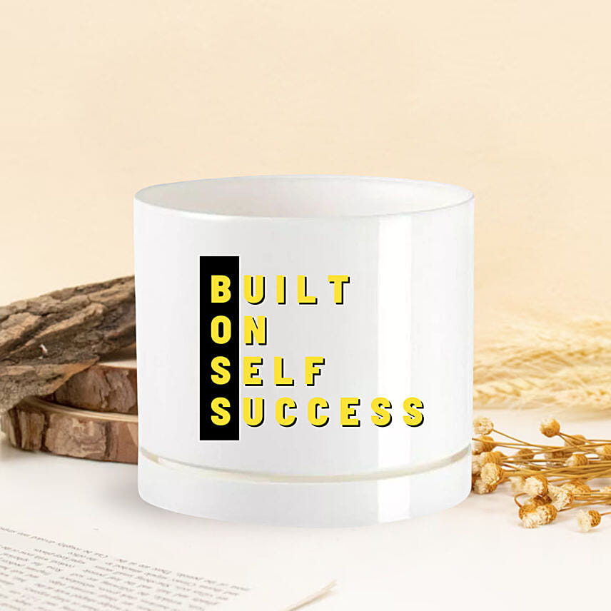 A sleek white container with the acronym "BOSS" spelled out as "Built On Self Success" in bold yellow and black. This motivational phrase emphasizes independence, self-reliance, and achievement, making it an ideal item for anyone who values self-made success and leadership.