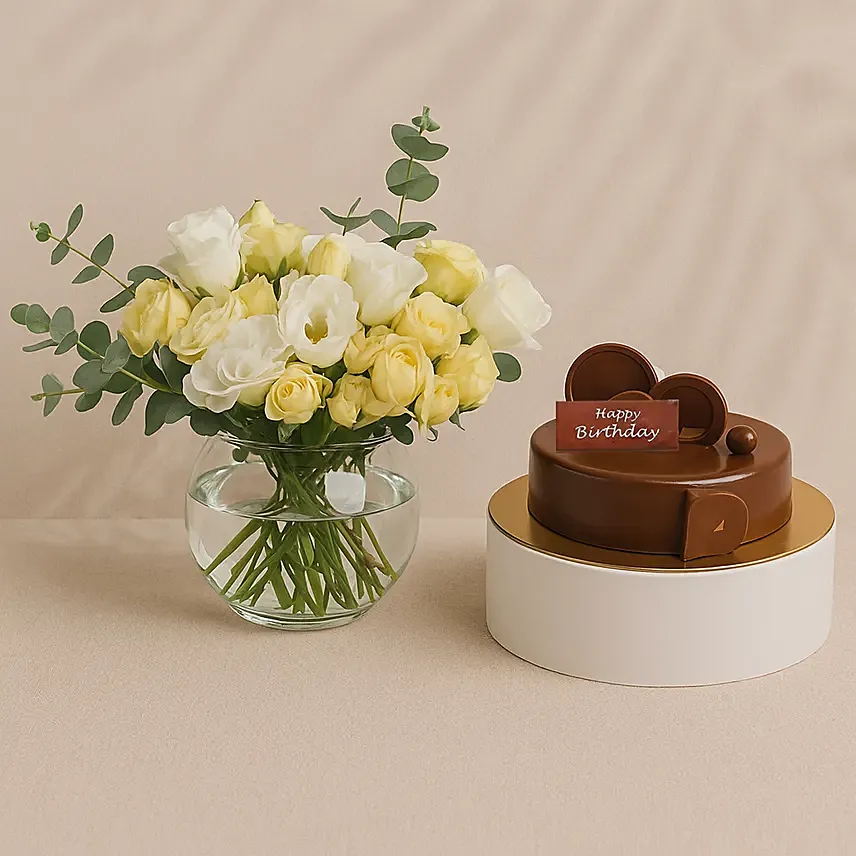Elegant Rose And Lisianthus Bloom Bowl With Decadent Fudge Cake