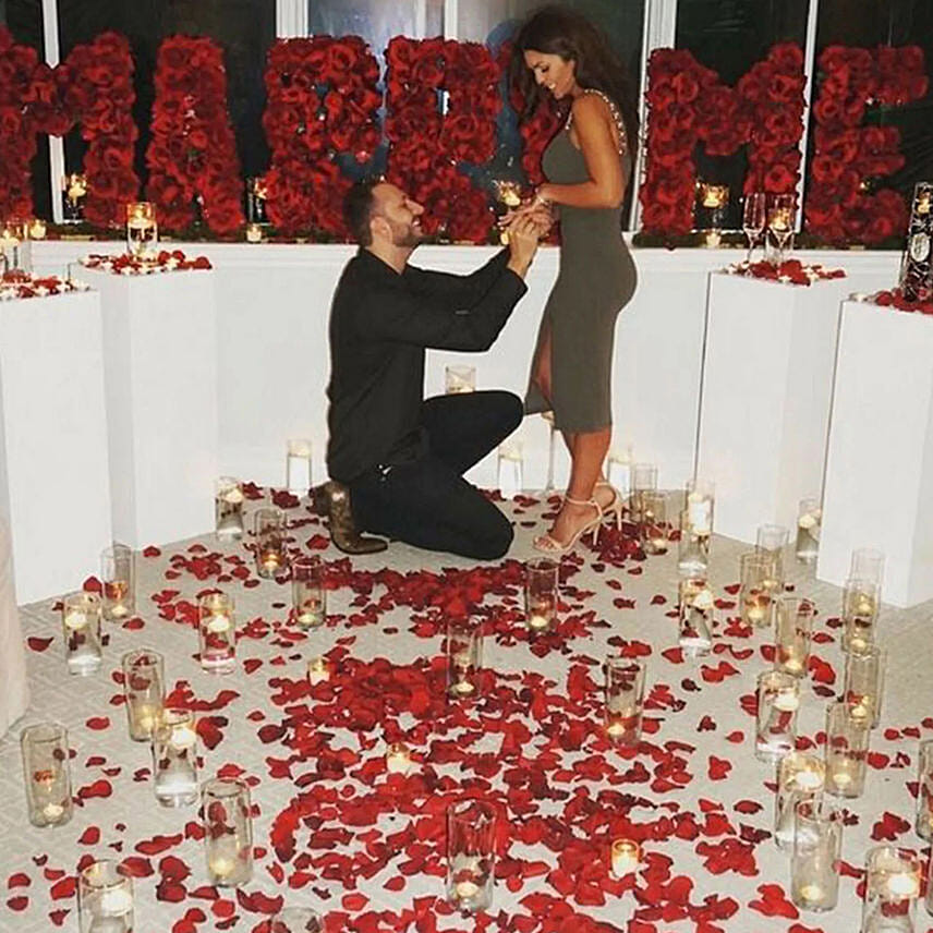 Pop the question in style with this ultimate proposal set. Gorgeous floral letters spelling 'Marry Me' along with strewn petals and dreamy lights to complete the ambience. We can set up this idyllic proposal so that you can surprise your beloved.