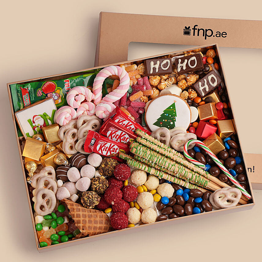 Make the festive season sweeter with this Premium Christmas Candy & Chocolate Indulgence Box a joyful explosion of colors, textures, and irresistible treats. Beautifully arranged in an elegant FNP signature box, this hamper is packed with festive chocolates, marshmallows, gourmet popcorn, candy canes, crunchy pretzels, and an assortment of delightful candies. Featuring adorable Christmas-themed cookies and premium chocolate varieties, this vibrant and playful gift box is perfect for kids, families, corporate celebrations, or anyone who loves holiday sweetness.