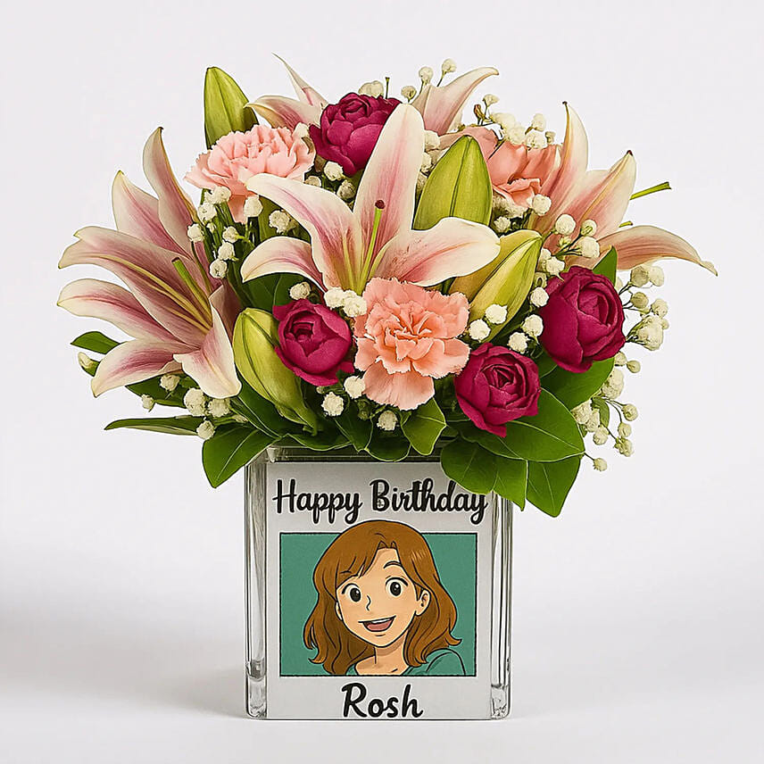• Arranged beautifully in a Ghibli Engraved Vase with an image of your choosing.