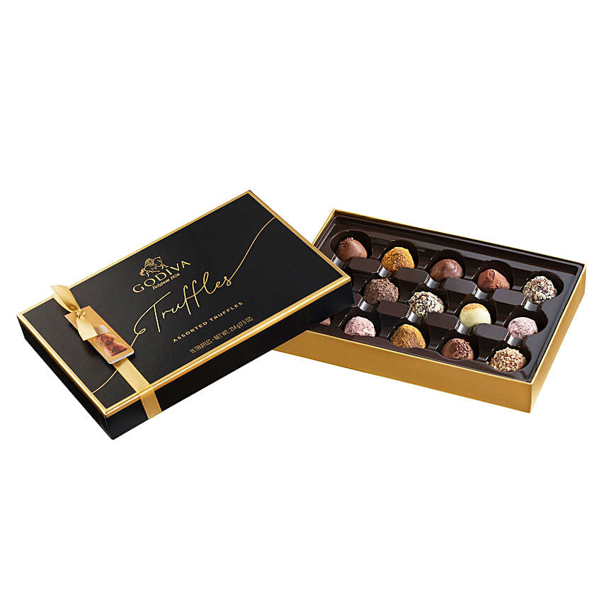 Give a box of Godiva's chocolate truffles, and you'll be adored for your excellent taste in gifts! This elegant gift box of Assorted Truffles holds fifteen pieces of the most luscious and legendary milk, dark and white chocolate truffles. Experience unparalleled taste and quality in exciting flavors and satisfying textures.This stunning chocolate truffles gift box, finished with a gold ribbon, is a sophisticated gift idea for birthdays, anniversaries, or any occasion. It's also a decadent dessert idea for sharing at your parties or for gifting to a holiday host.