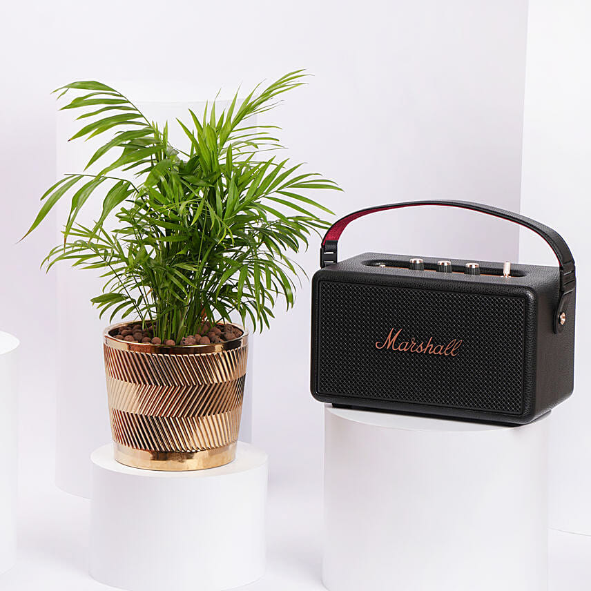 "Bring elegance, freshness, and powerful sound into any space with this luxurious pairing The set features a vibrant indoor palm plant placed in a premium metallic golden pot Known for purifying air and enhancing ambiance, this lush green plant not only uplifts the surroundings but also brings positivity and a refreshing vibe to the room. Accompanying the greenery is the iconic Marshall Bluetooth Speaker, designed with the brand’s signature retro styling in black with brass accents. Compact yet bold, it delivers an immersive sound experience with deep bass and crisp treble, making it perfect for music lovers. The leather strap handle makes it easy to carry, ensuring your music goes wherever you do. Together, this set blends nature and technology seamlessly one offering tranquility, the other delivering energy and rhythm. Perfect as a thoughtful gift for birthdays, anniversaries, housewarmings, or premium corporate occasions, it’s more than just a present; it’s a lifestyle upgrade."