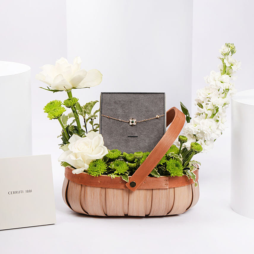 Symbol of love and beauty, delight your loved ones with this exquisite Gold plated bracelet from Cerruti 1881.Designed with intricate details, this star shaped charm features stunning centerpeice, accentuated by delicate sparkling stones that add a touch of brilliance to every movement.Presented in a guft basket with flowers. Make your special moments unforgettable with this luxurious bracelet gift set a token of love that will be cherished forever.