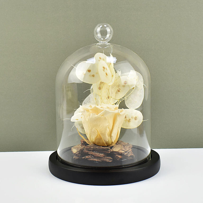 Show the intensity of your love with this lovely forever peach rose to your partner. This forever peach rose glass dome is exquisite enough to liven up your partner's mood.