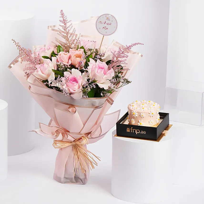 A gentle expression of love and celebration, this beautifully wrapped bouquet of blush pink blooms is paired with a delightful cake to make every moment sweeter. Perfect for birthdays, anniversaries, or simply to say ‘you matter,’ this graceful arrangement turns emotions into unforgettable memories