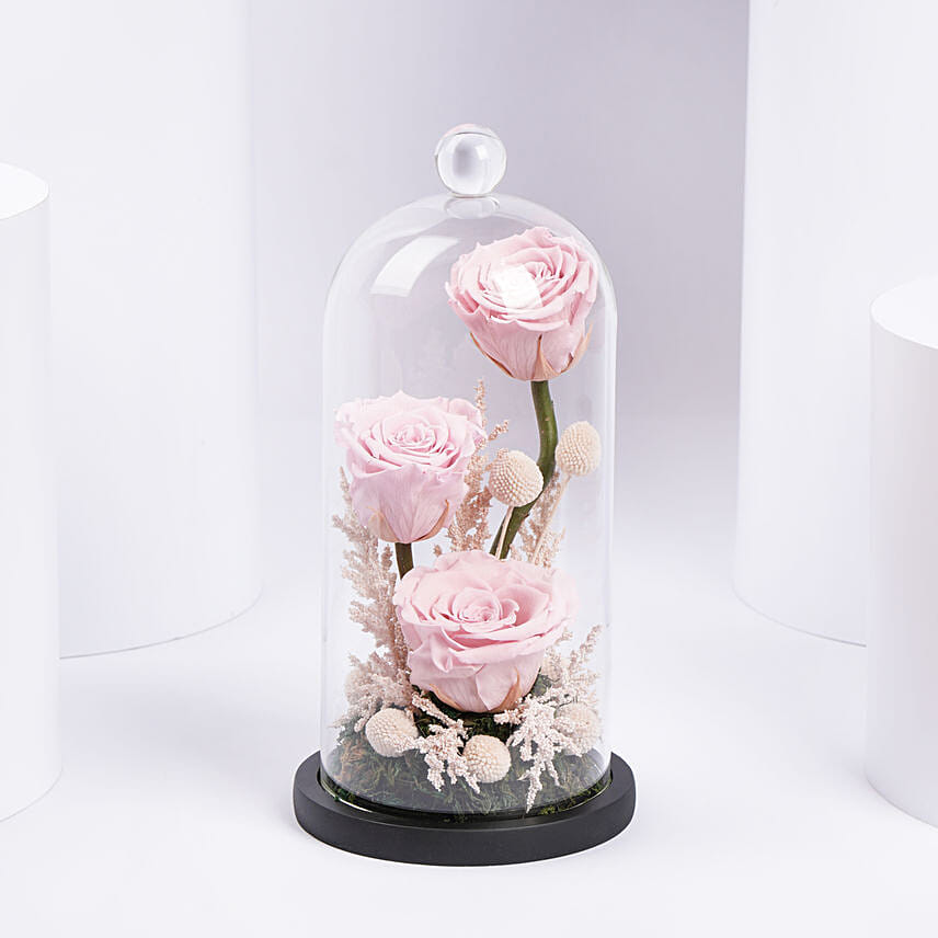 The arrangement exists as a reminder: while life may change and fade, some moments and feelings remain forever untouched, perfectly preserved under the dome. Whether given as a gift or kept as a memento, this delicate creation invites contemplation, celebration of timelessness, and the beauty that endures.