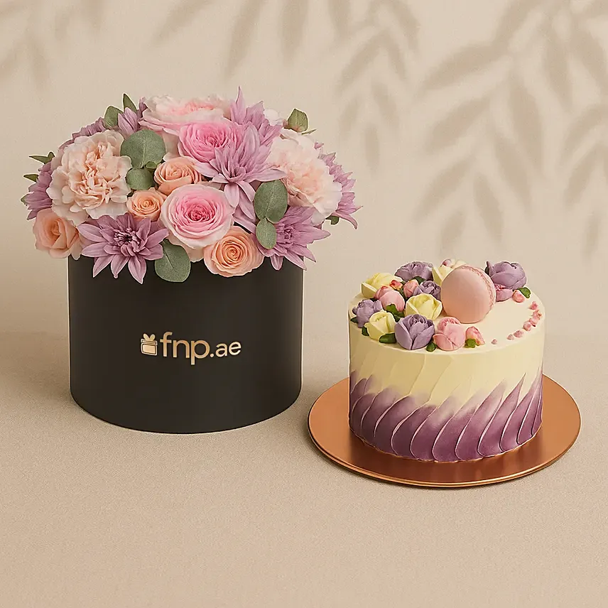 Premium Black Box Flower Arrangement With Chocolate Macaron Cake