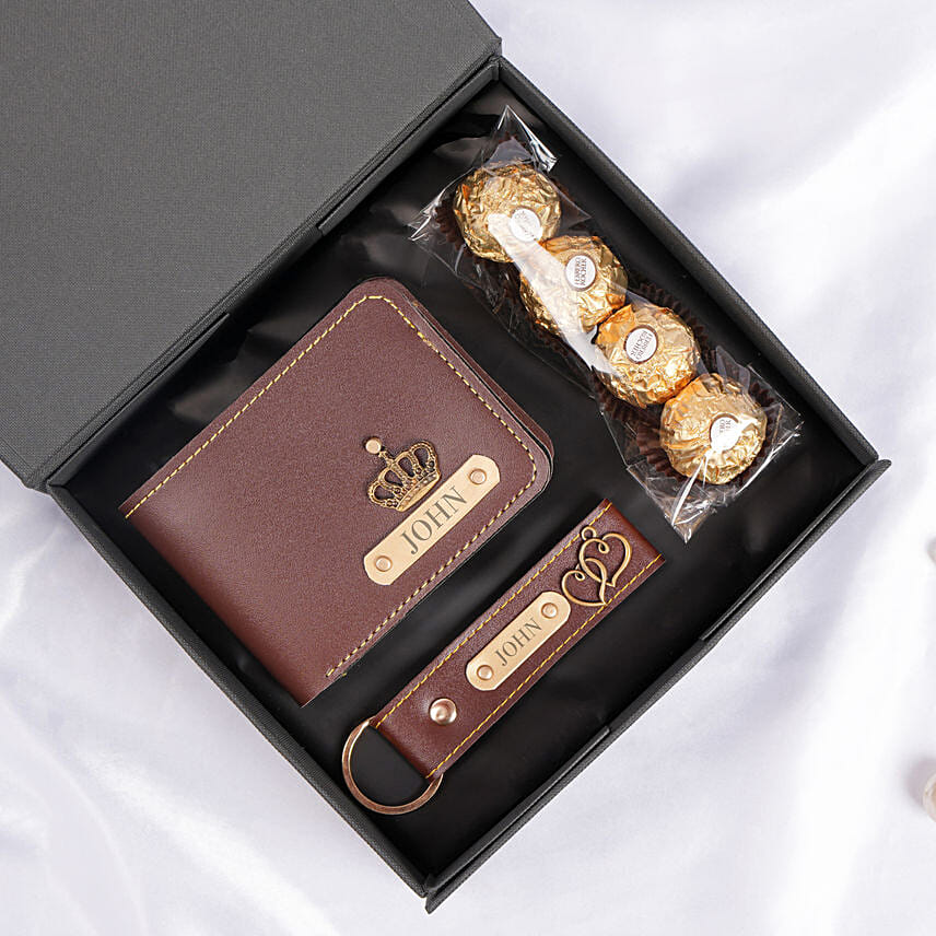 Gift a perfect blend of style, practicality, and indulgence with this elegant combo. The personalized wallet adds a touch of sophistication to their daily essentials, while the keychain offers a thoughtful way to keep their keys secure and stylish. To sweeten the gesture, four Ferrero Rocher chocolates provide a moment of pure indulgence. This combo is an ideal choice for showing appreciation, love, or celebrating special occasions with a personal touch.