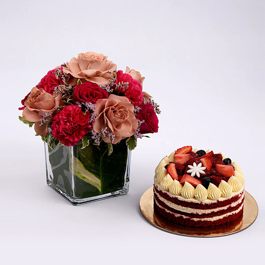 Rose and Carnation Flowers with Red Velvet Cake