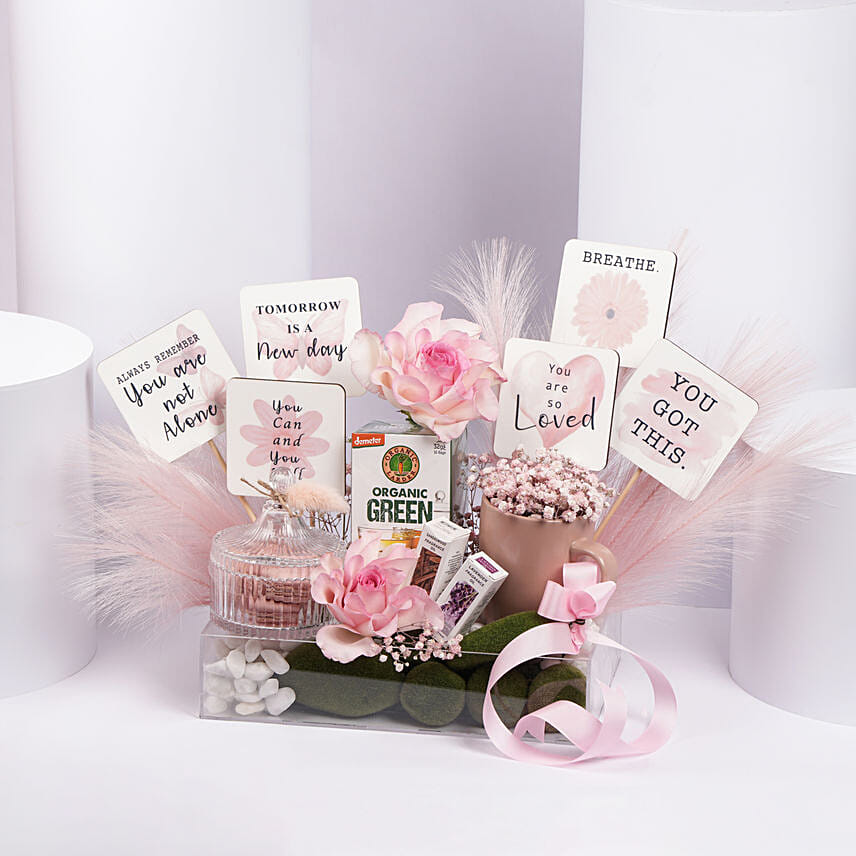 a meticulously designed gift hamper that is set in a transparent acrylic box with a pink-themed arrangement. It carries a message of positivity, encouragement, and relaxation, conveyed through various elements and motivation.