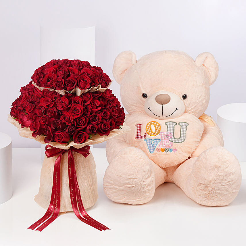 Valentines 100 Red Roses With 5Ft Teddy Bear