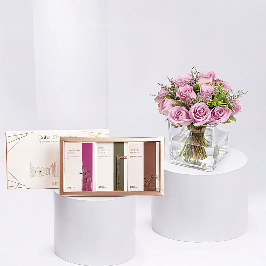 Vase Of Royal Purple Roses With Dubai Chocolates