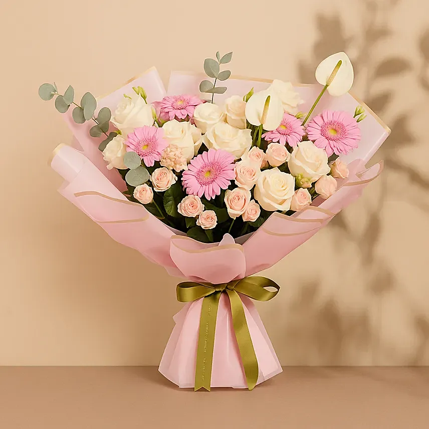 • Arranged Beautifully In Bouquet Tied With Green Ribbon