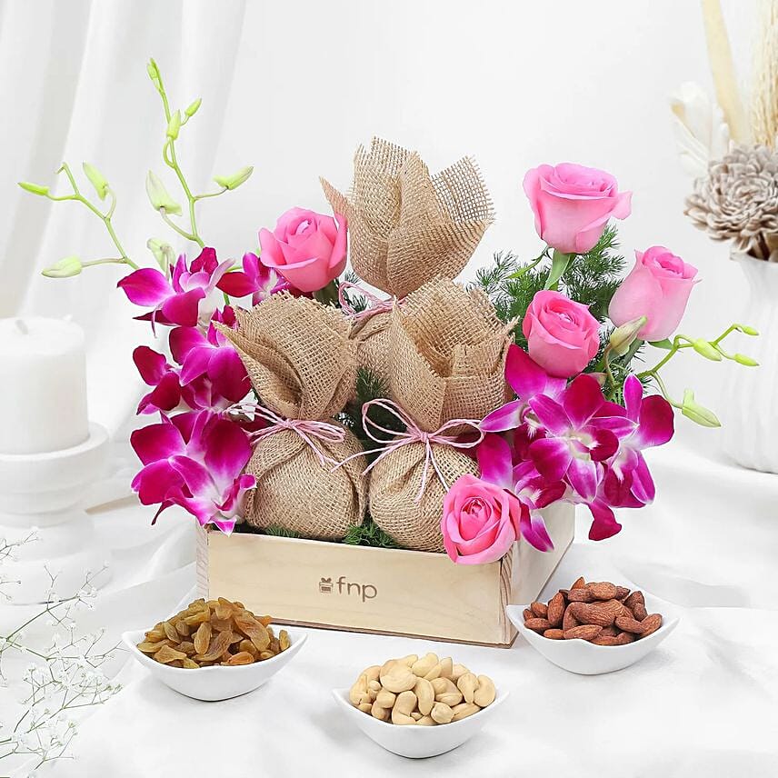 Celebrate the warmth and love of motherhood with this elegant wooden tray featuring aqua pink roses vibrant purple orchids lush green fillers and premium dry fruits in jute potlis. A perfect blend of beauty and health this thoughtfully curated gift speaks volumes of your affection. Surprise your mom with this graceful arrangement and make her feel pampered cherished and deeply loved this Mothers Day.