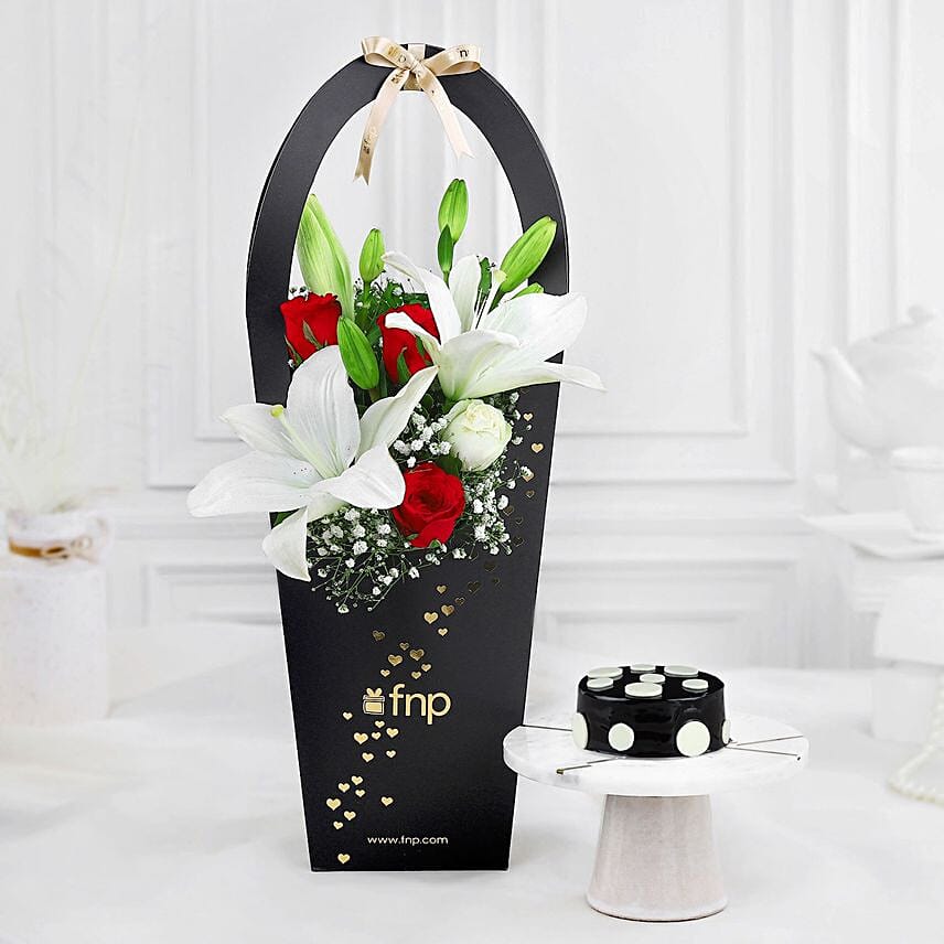 Embrace the essence of luxury with our Opulent Elegance Celebration Set. This lavish combo features a decadent Truffle cake, complemented by a bouquet of premium red and white roses, Asiatic white lilies, and delicate white gypsophila fillers, elegantly wrapped in black paper and adorned with a golden satin ribbon. Perfect for grand celebrations, this set suits individuals who appreciate refined taste and sophistication. The red roses symbolise love and passion, while the white roses represent purity and elegance, harmonising beautifully with the innocence of the Asiatic white lilies. The rich flavours of the truffle cake add a touch of indulgence to the occasion, creating a truly unforgettable experience. Ideal for commemorating milestones, birthdays, or any special moment deserving of opulence and elegance.