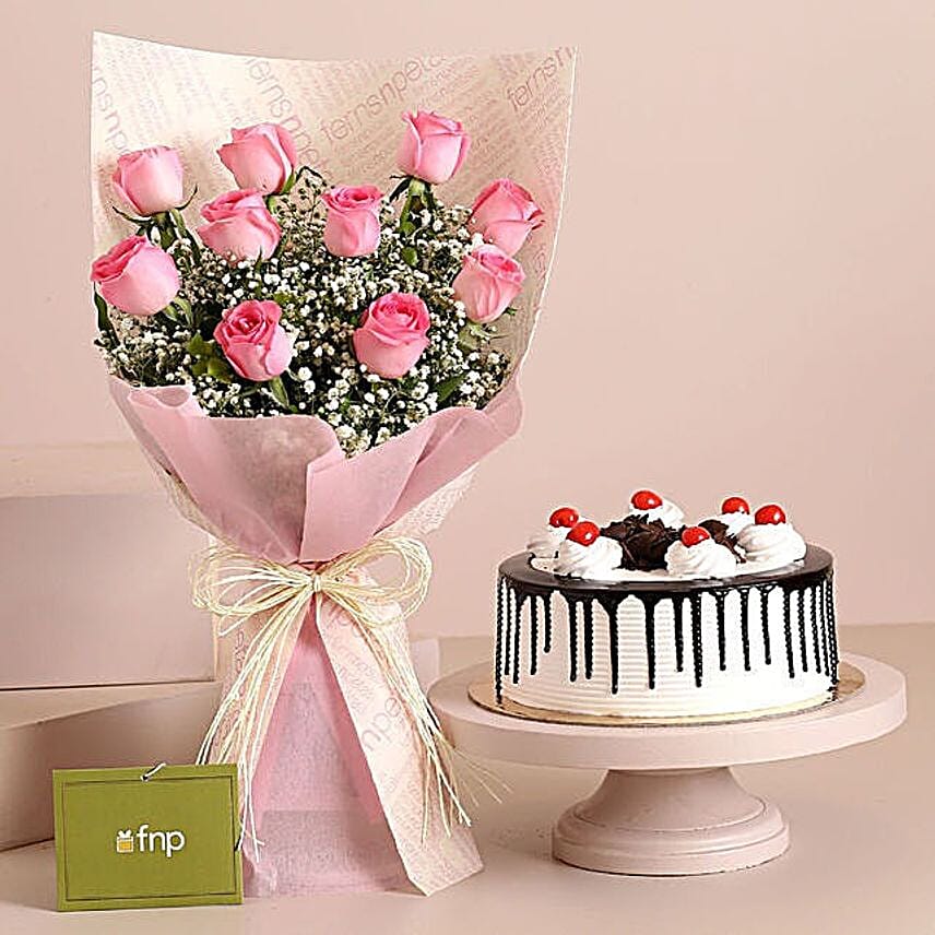• Spellbinding pink roses are delicately wrapped in pastel pink paper and tied with raffia to delight the receiver. Sprinkled with babys breath, this sassy but sweet bunch looks simply divine. Experience the decadent taste of black forest cake that tags along with this beautiful bouquet.