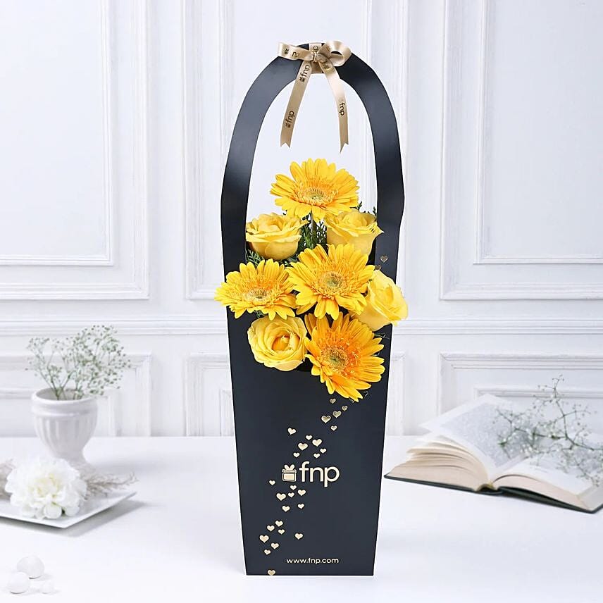 Brighten their day with this vibrant gift This exquisite arrangement features yellow gerberas and roses, radiating warmth and affection. The green morpankhi leaf filler adds a touch of natural beauty, while the golden satin ribbon adds an elegant finishing touch. Encased in a black sleeve adorned with big foil hearts, this gift is a heartfelt gesture that will bring joy and happiness to your special ones heart.