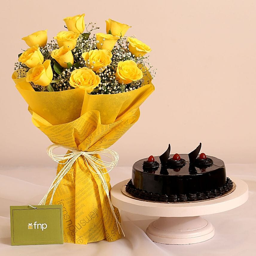 • Send beautiful sunshine and brighten up someone day with this bouquet of yellow roses. Sprinkled with baby breath, this vibrant bunch will lighten up your loved ones and make them happy. The heavenly sweetness of chocolate truffle cake is the cherry on top, literally