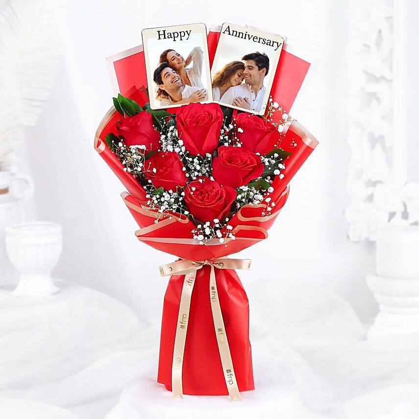Celebrate love and togetherness with this enchanting bouquet of red roses paired with two personalized fridge magnets that say Happy Anniversary. The magnets printed with your favourite images add a personal touch to this thoughtful gift. Perfect for your partner spouse or a special couple this gift beautifully combines the timeless elegance of roses with heartfelt personalization. Its an unforgettable way to mark the anniversary and create lasting memories.
