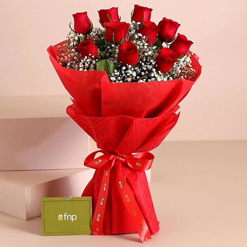 Fall in love with this classic bouquet of red roses wrapped in red paper. Sprinkled with White Gypsophila Gypsy Fillers, this love-infused bunch looks simply magical. Let your special someone know how much you love them with the help of this spellbinding bouquet.