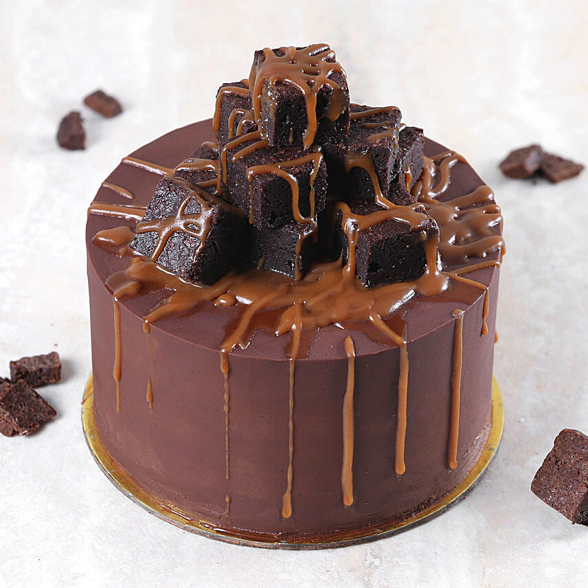 Layers of rich chocolate brownie, and light caramel sponge, filled with a salted caramel buttercream, and covered in a dark ganache. Finished off with a stack of little fudgy brownie squares, and a generous pour of salted caramel sauce.