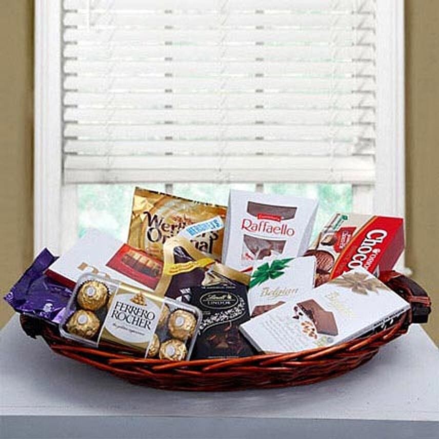 Unwrap the pure indulgence of chocolate experience with this lip smacking wide array of chocolates. A perfect idea for gifting chocolate lovers, this assorted basket includes Ferrero Rocher, Raffeallo chocolates. Candies, Belgium chocolates, choco pie and a pack of mini dairy milk chocolate. This delicious treat plays a wonderful role in delighting your loved ones with this irresistible chocolaty treat.