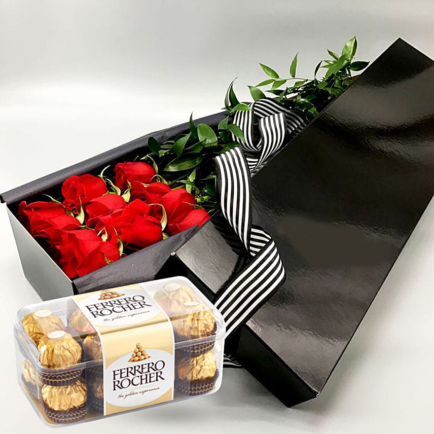 • A dozen of Ecuadorian Roses in a black long Box with ferrero chocolates box.