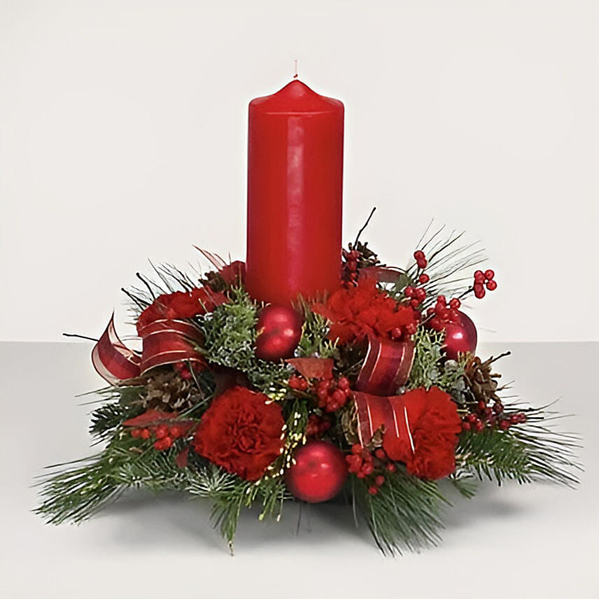 • Christmas Red Candle Light with pine Cones is nestled in amongst an array of rich Red Carnations Red berries