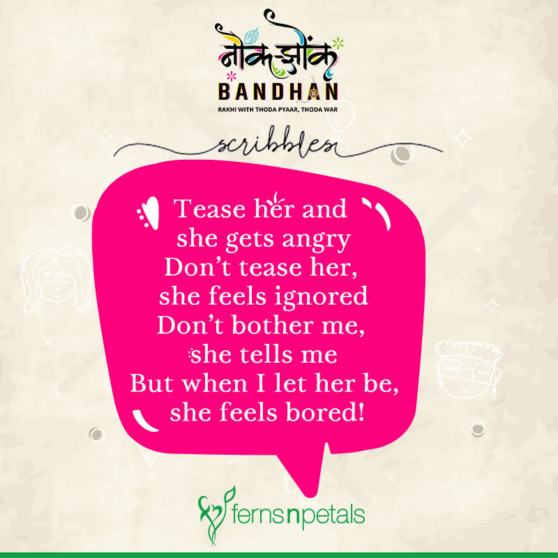 Dear sister, I thought about getting you a gift, but then I realized that annoying you all year round is a gift enough! Anyway, I promise to always protect and support you, no matter what. Happy Raksha Bandhan!