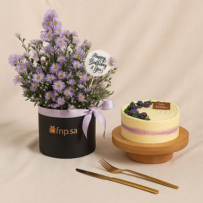 Surprise your loved one with a birthday gift that combines elegance and exquisite taste. This special bouquet includes a stunning arrangement of purple aster flowers inside an elegant black FNP box, along with a beautiful cake decorated with delicate purple roses and a Happy Birthday message. A perfect gift for your loved ones on their special day.