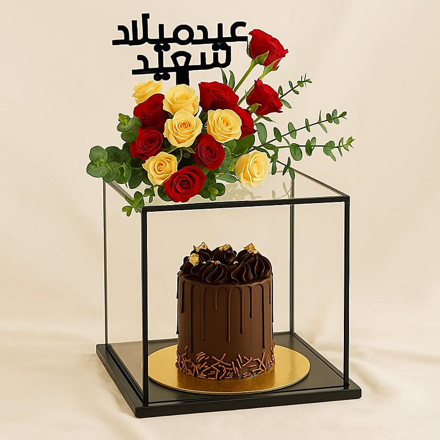 Celebrate a special birthday with the Birthday Gifts Chocolate Cake and Rose Bouquet. This wonderful combo features a decadent chocolate cake with a beautiful bouquet of red and peach spray roses, decorated with eucalyptus sprigs. Presented in a luxurious tall box with a wooden base and decorated with a Happy Birthday message, it s the perfect way to add sweetness and elegance to your birthday celebration.