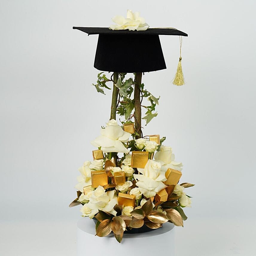 1 ivy leaves6 white roses4 spray roses white8 gold spray Ruscus1 salix stickTrayHat