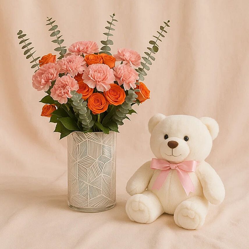 Make any moment even more special with a cheerful rose vase featuring stunning carnations. The rose vase comes with a cute white teddy bear. A perfect gift to spread smiles on a birthday, graduation, or any other happy occasion.