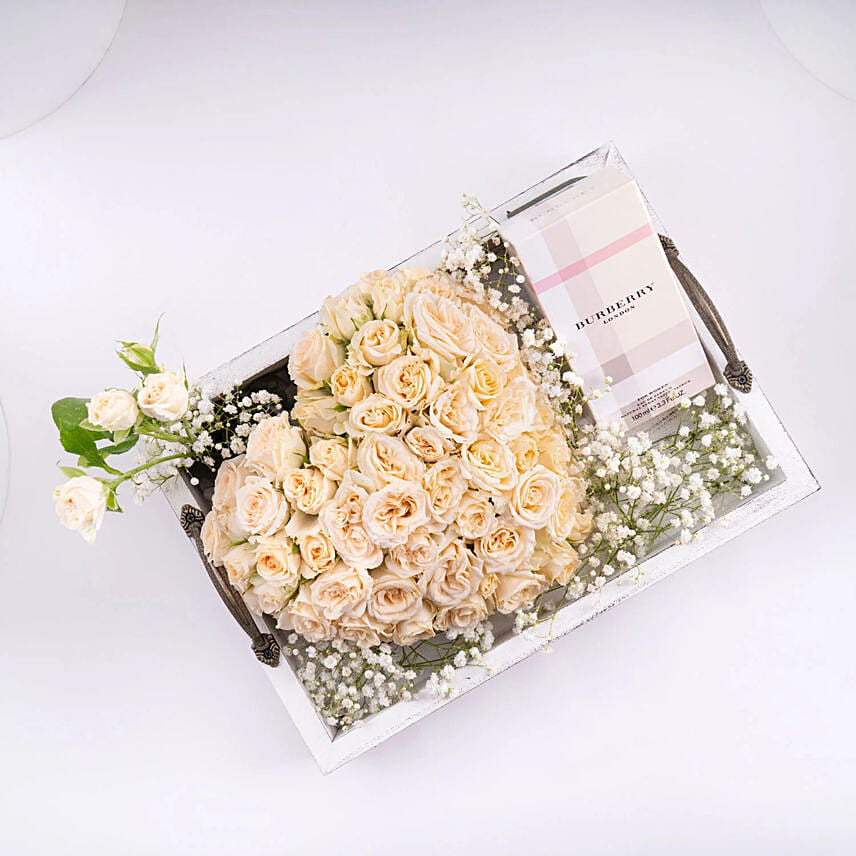 Celebrate in style on all occasions and happy moments with the elegant rose and perfume combo from FNB. This box has been carefully curated to be the perfect gift on Mother's Day, anniversary, or any other special occasion. The box contains bleft roses and the famous Burberry London women's perfume, making it an elegant and aromatic expression of feelings.
