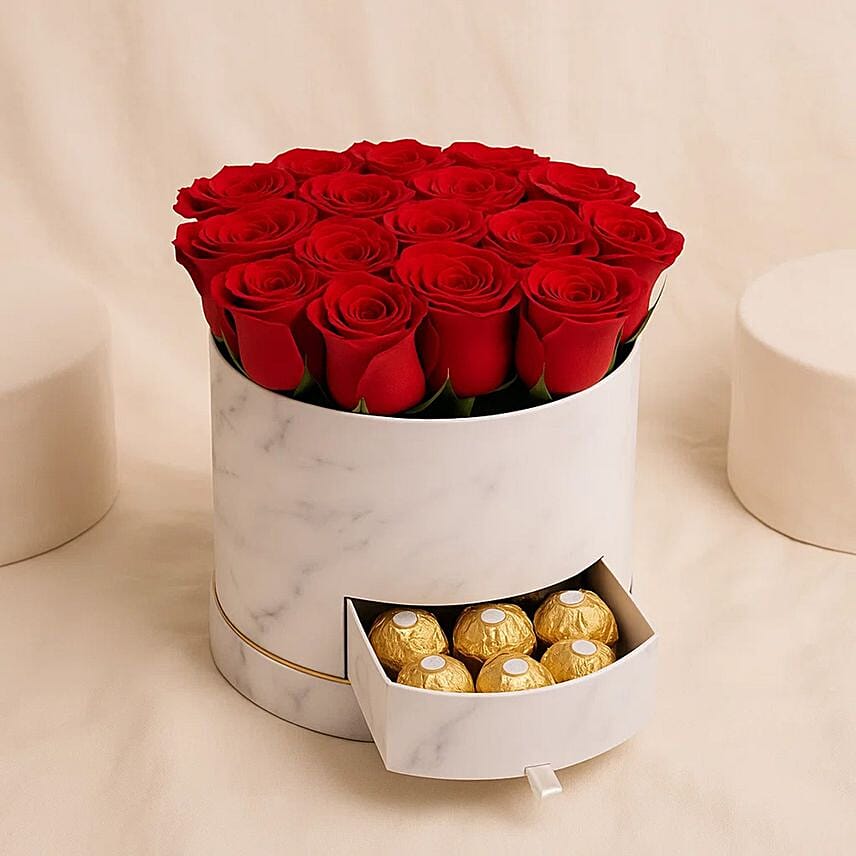 Express your love with a charming red rose box with Ferrero Rocher. This elegant rose and chocolate gift set combines a luxurious Ferrero Rocher chocolate box with a bouquet of enchanting red roses, beautifully arranged inside an elegant white box. It is perfect for making any moment memorable on a birthday, wedding anniversary, engagement party, or any other romantic occasion.