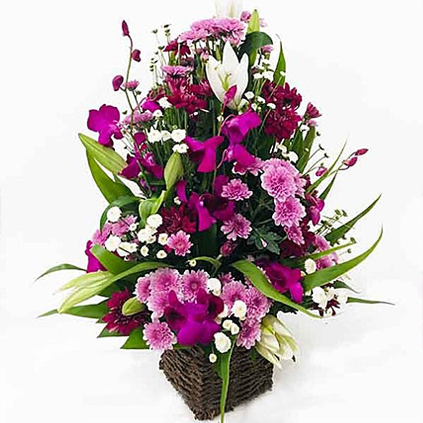 Elegant Basket Of Orchids N Seasonal Flowers