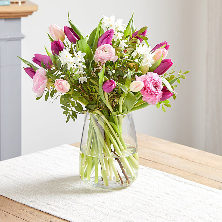 The Marguerite Is An Elegant Bouquet That Is Sure To Make Someone Feel Flush When They Receive It As A Gift. The Monochrome Colour Scheme Goes Through All The Tones Of Pinky Purple With Paperwhites, Charming Pink Tulips And Ranunculus, And The Deep Magenta Tulips.