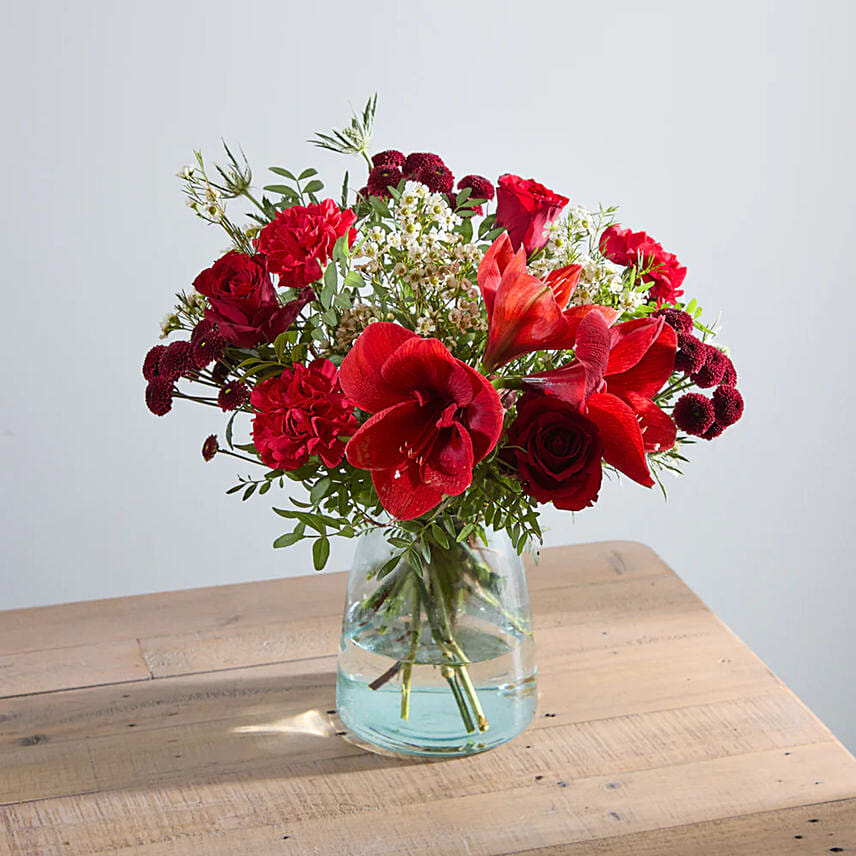 Any fan of the Christmas season is sure to love receiving this fittingly festive bouquet. A striking combination of vivid red, soft white, and cool green flowers and foliage, our Rejoice arrangement is brimming with uplifting seasonal shades.