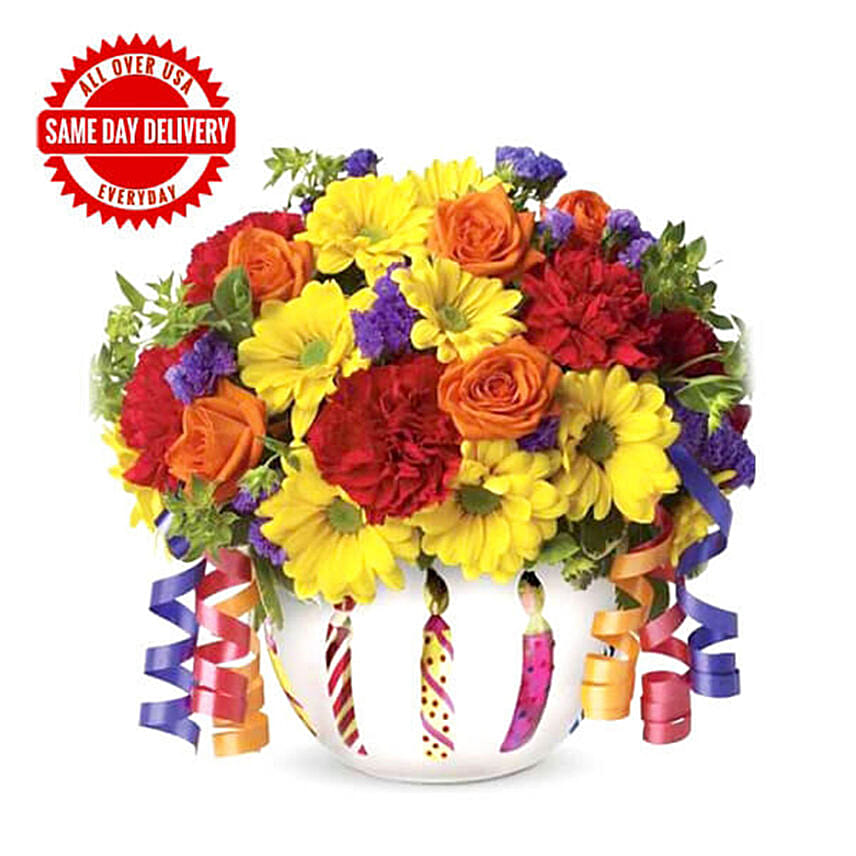 The vibrant colored flowers and party decorations all share a frosted glass bowl with decorative candles. Arranged by a local florist and delivered with bright roses, carnations and spray mums.